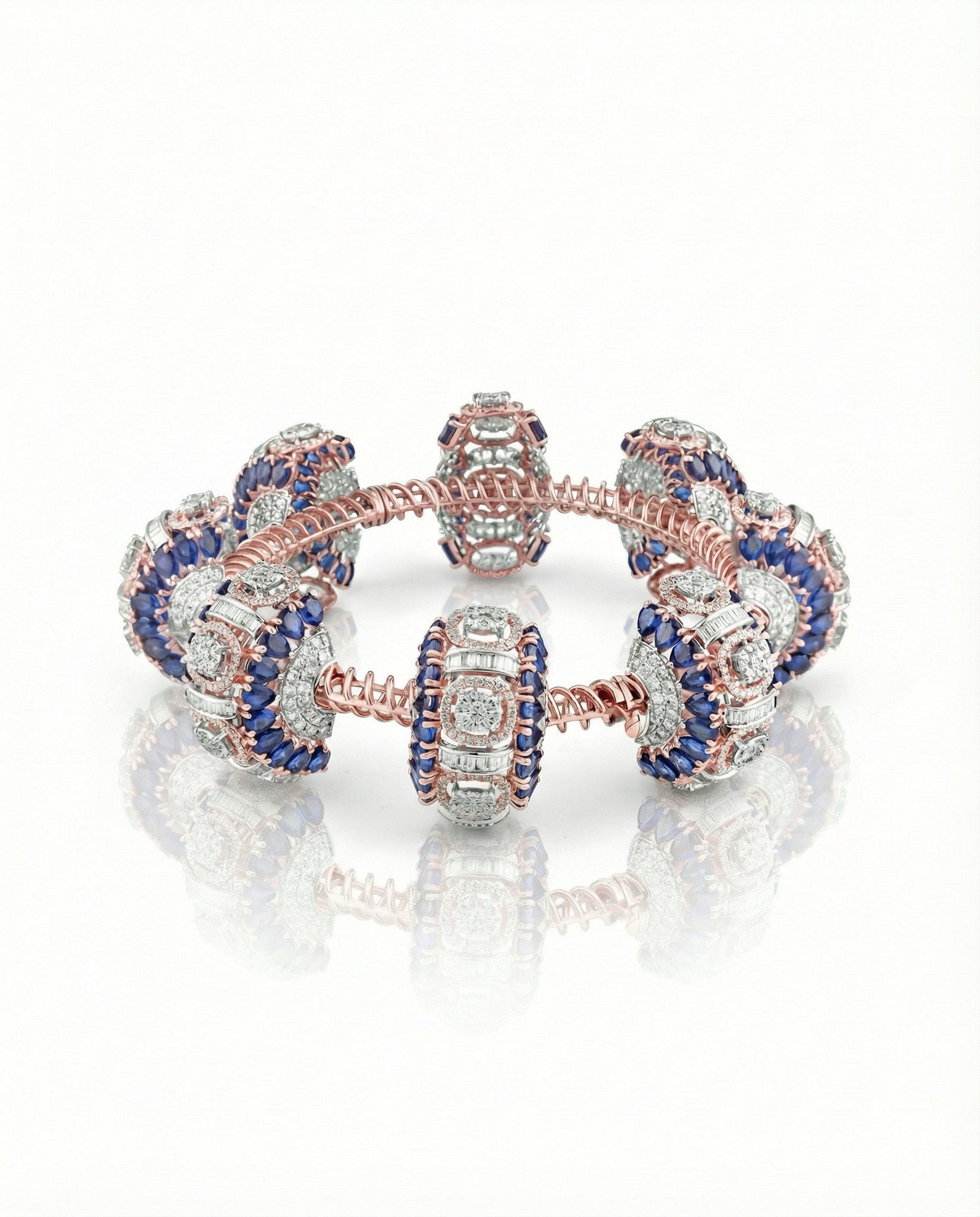 A cosmic dance of light and color. Featuring electric blue sapphires and brilliant-cut diamonds, this bangle utilizes a unique "floating" setting on a textured rose gold band. It is a modern reimagining of the classic tennis bracelet, designed for gala evenings and high-profile events