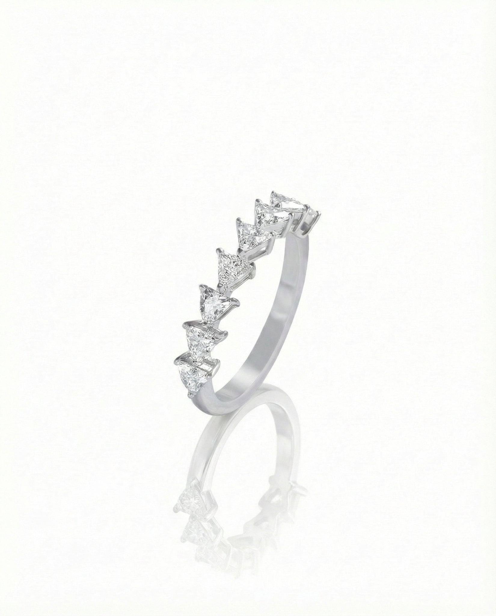 Elevate the traditional wedding band with a sharp, contemporary edge. Featuring a sequence of brilliant trillion-cut diamonds set in lustrous white gold, this ring is designed for the woman who finds beauty in geometry. It’s a statement of eternal love, reimagined for the 21st century.