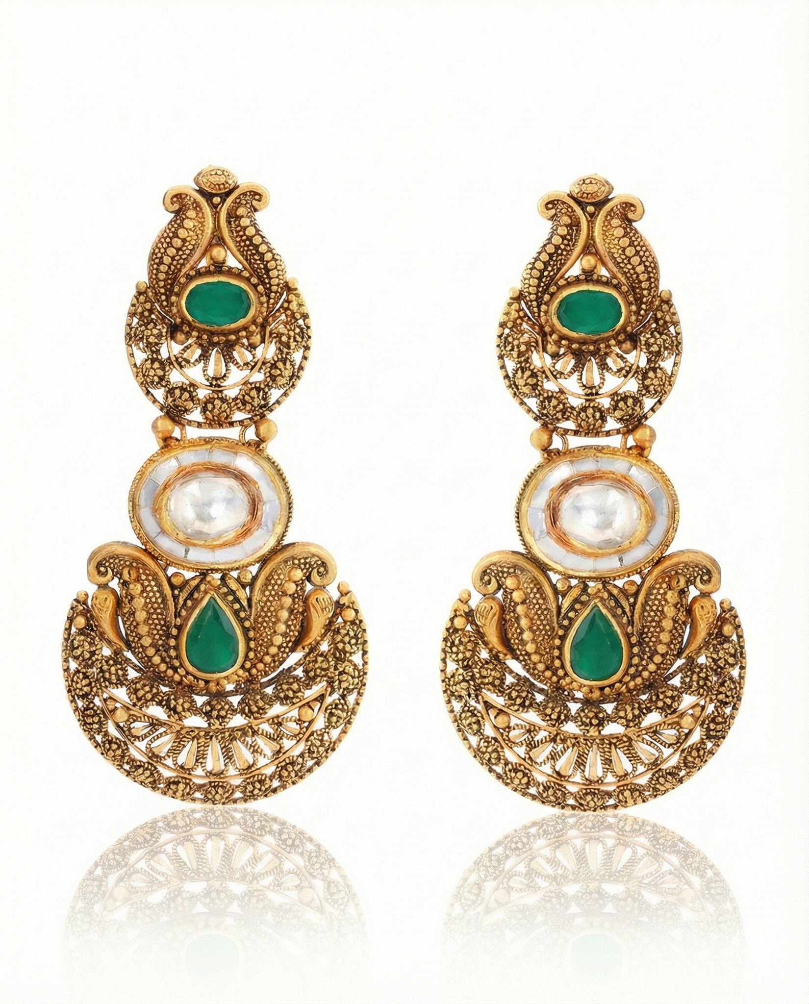 Intricate Filigree with Polki and Emerald Accents Capture the essence of old-world charm with these masterfully crafted gold drops. Featuring a classic Chand-Bali silhouette, the earrings are adorned with shimmering Polki-style centers and rich green emerald accents. The fine gold granulation and textured filigree work showcase an extraordinary level of artisanal detail.
