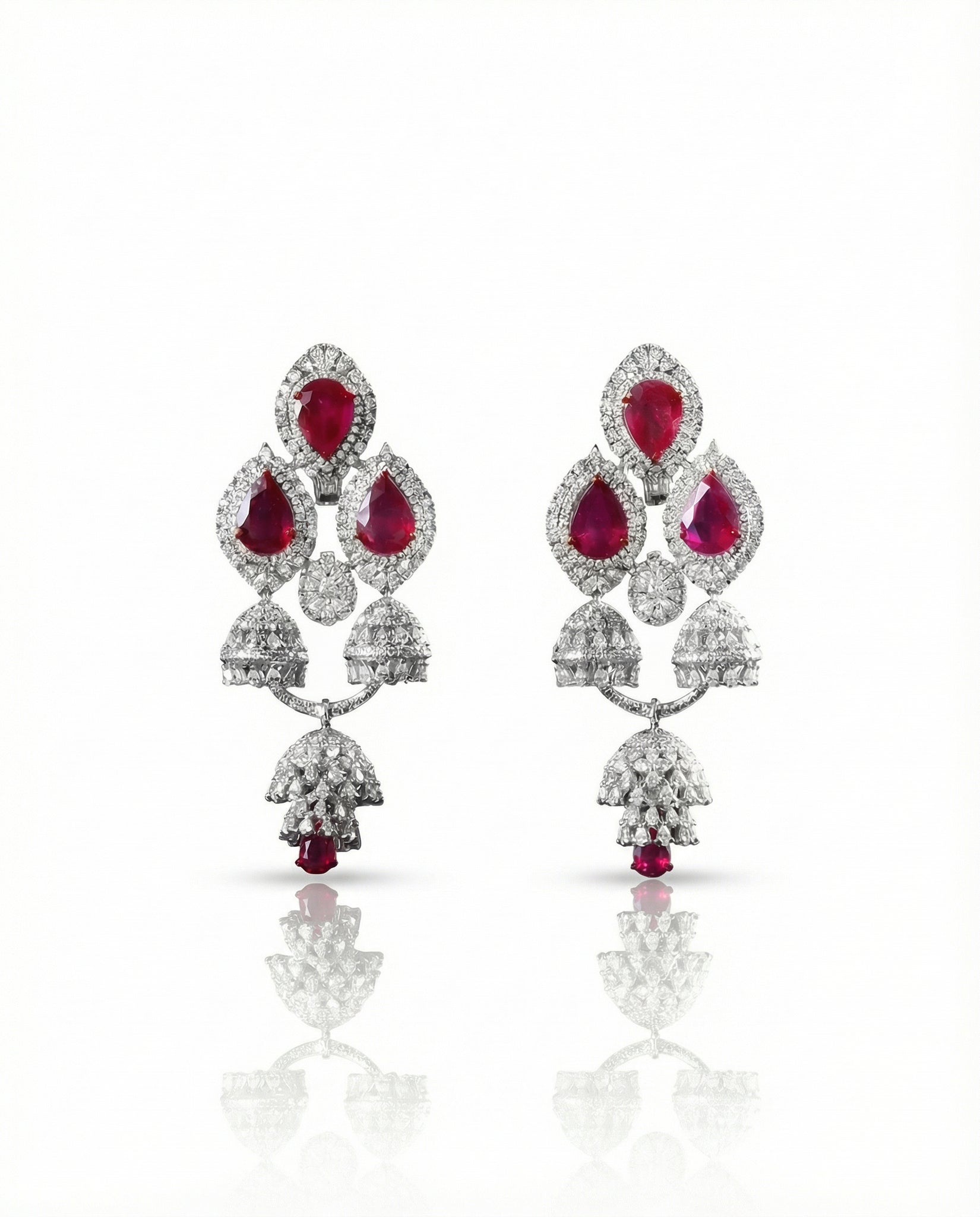 Royal Elegance in Ruby and Tiered Diamonds A fusion of regal splendor and intricate detail. These tiered chandelier earrings feature vibrant pear-cut rubies encased in a dense pavé of brilliant diamonds. The design flows into a double-bell Jhumka silhouette, finished with a ruby-accented droplet for a dramatic and balanced look.