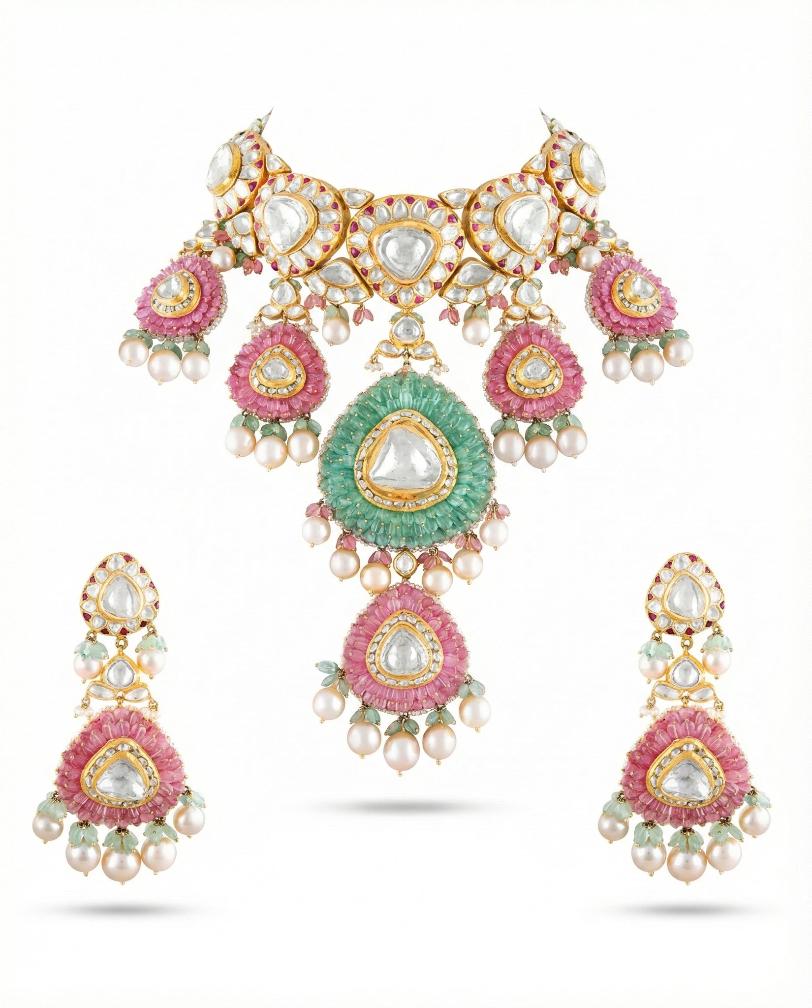 Command the room with a piece that bridges the gap between Mughal opulence and contemporary grace. This masterpiece features oversized, uncut Polki diamonds set against a rhythmic backdrop of mint-green enameled textures. The piece is finished with a breathtaking fringe of hand-tumbled ruby-hued beads, creating a dance of light and color with every movement.