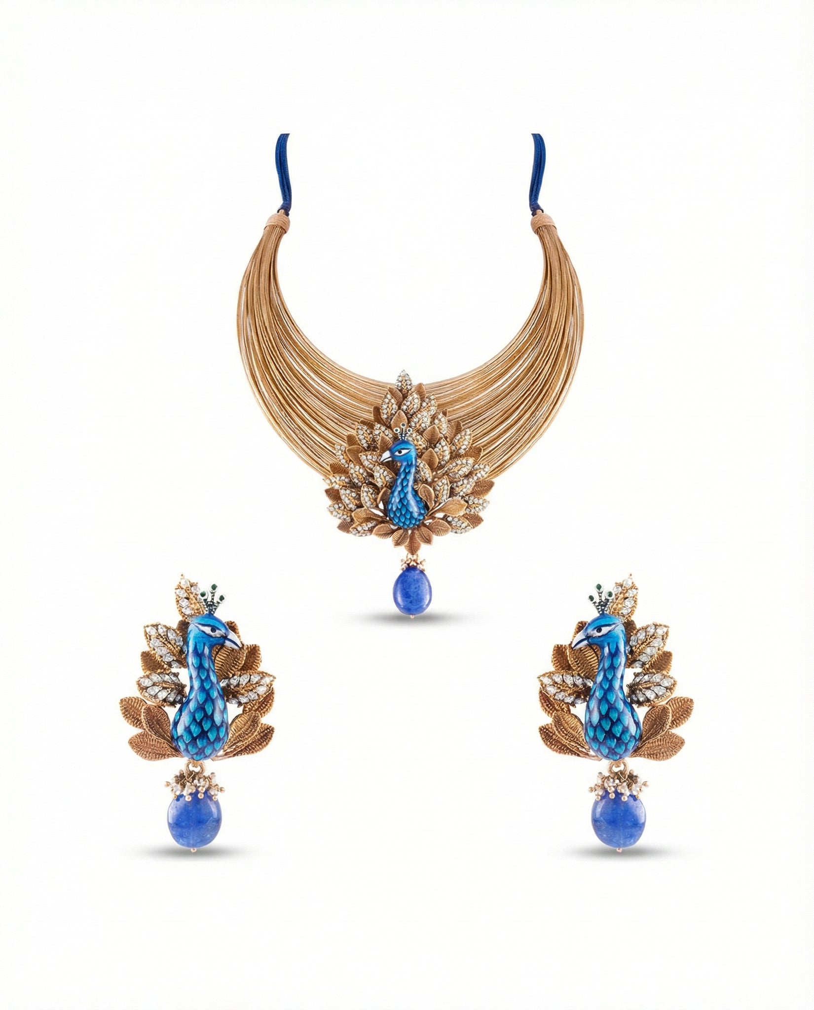 A tribute to the national bird of India, this suite is a triumph of Meenakari (enamel)artistry. The vibrant cobalt blue peacock motif is cradled by a sunburst of golden textured feathers and delicate diamond accents. Suspended from multiple strands of liquid gold chain, this set is a wearable piece of art that symbolizes grace and pride.