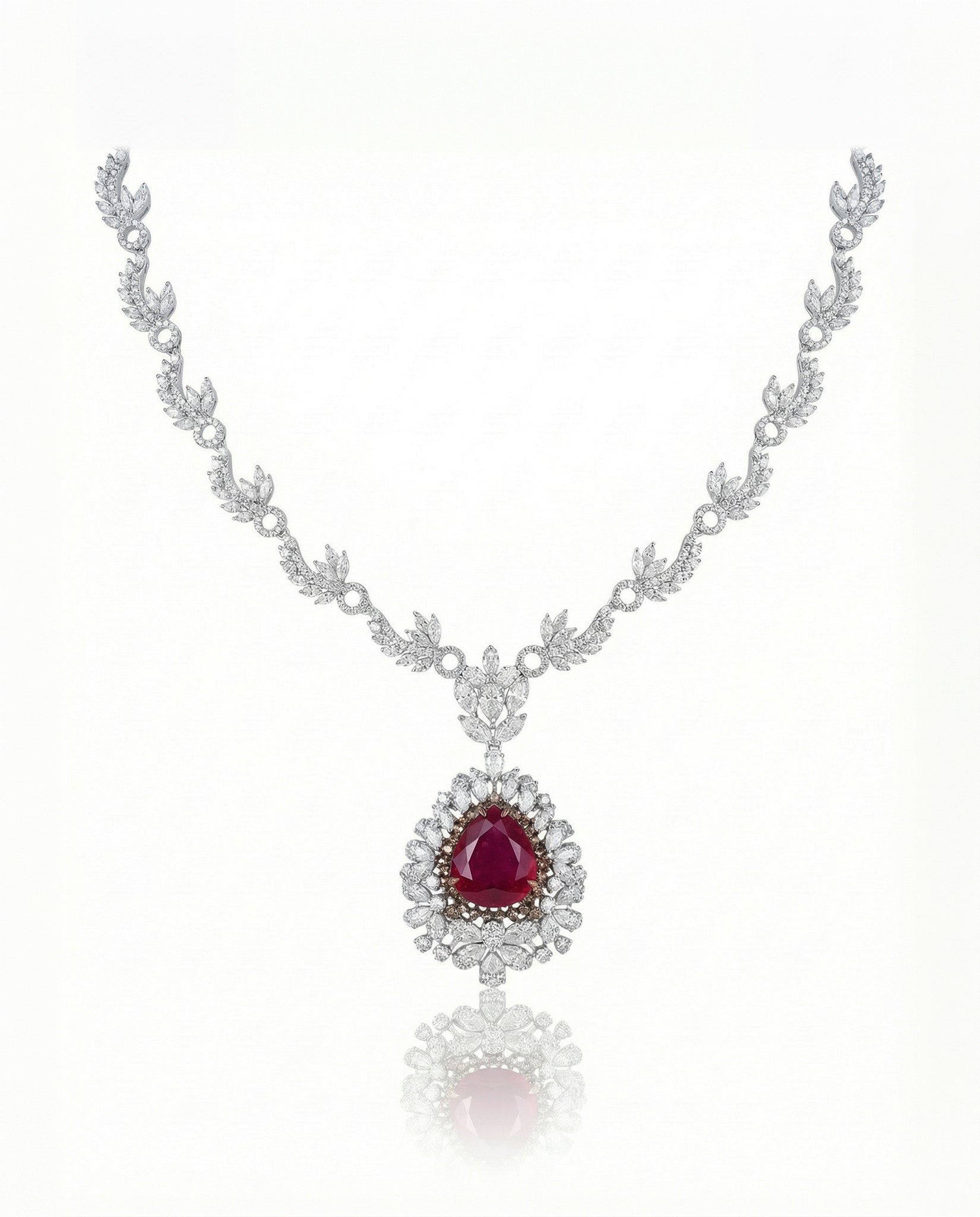 Sophistication meets passion in this graceful necklace. A delicate diamond-set vine wraps elegantly around the neck, leading the eye to a magnificent, deep-red pear-cut ruby. Surrounded by a double halo of brilliant diamonds, this piece is the perfect balance of modern luxury and classic romance.halo of brilliant diamonds, this piece is the perfect balance of modern luxury and classic romance.